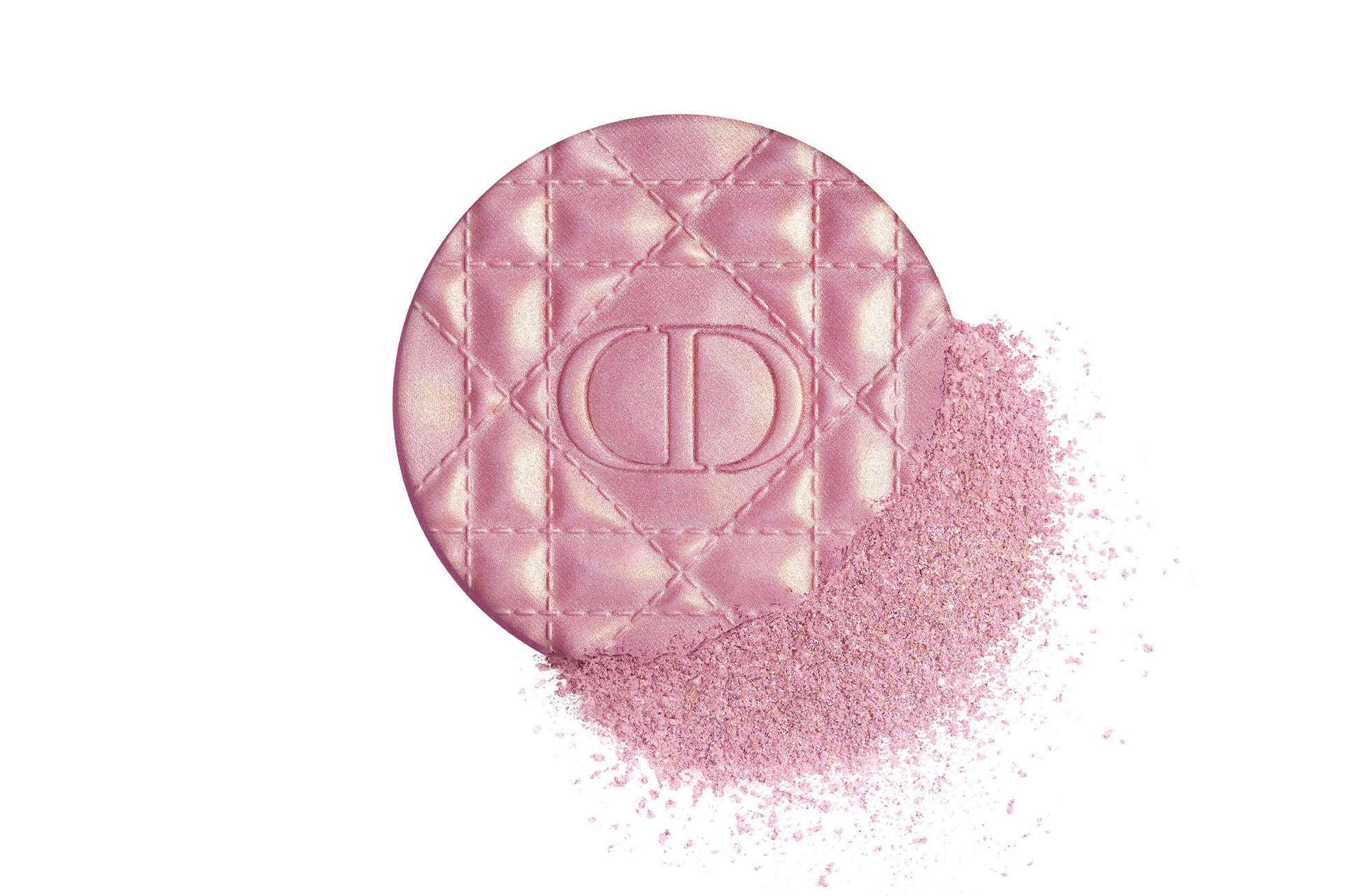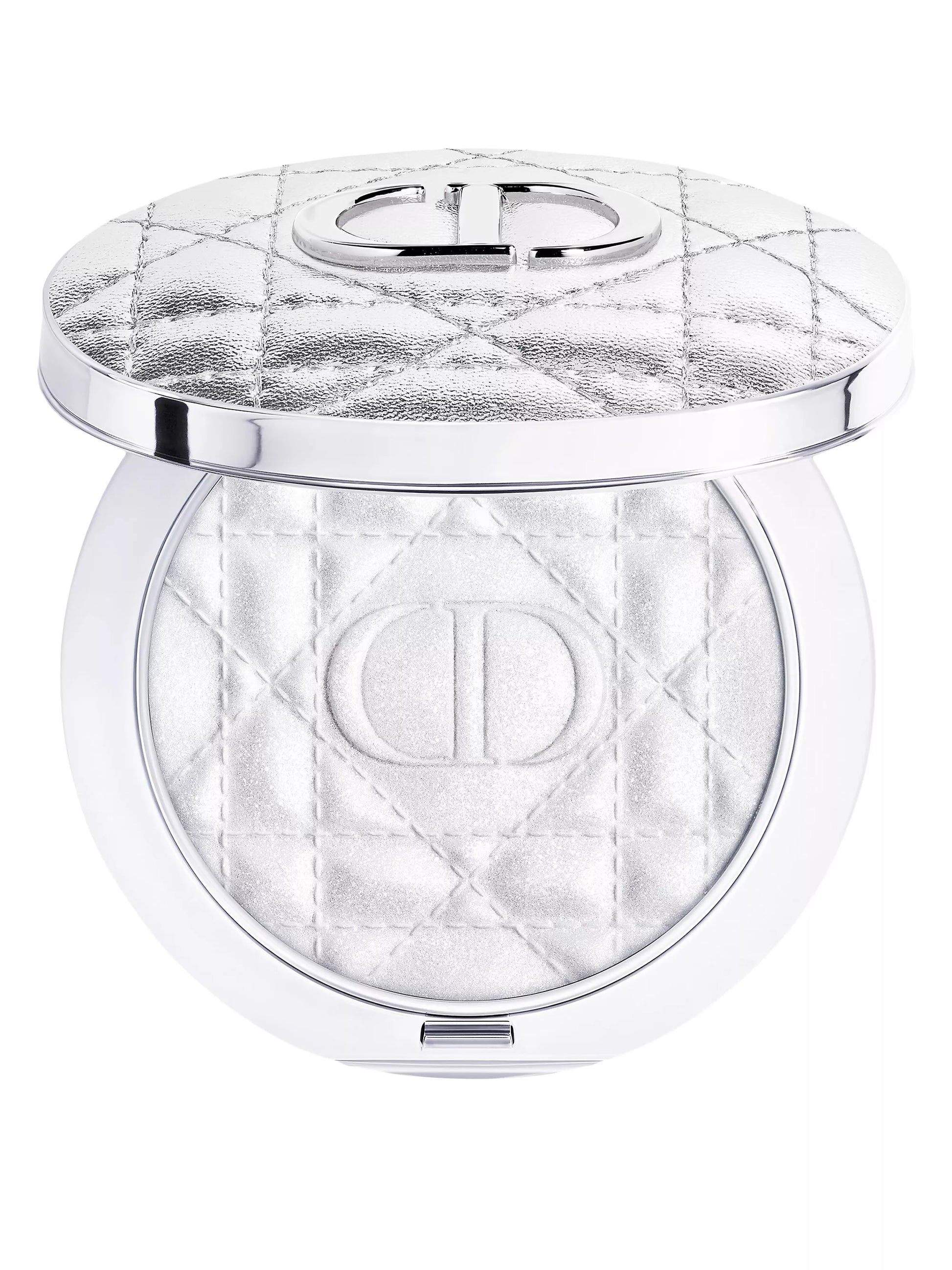 Un polvo brillante que se engancha en un estuche de alta costura plateado adornado con las iniciales "CD" para Christian Dior.