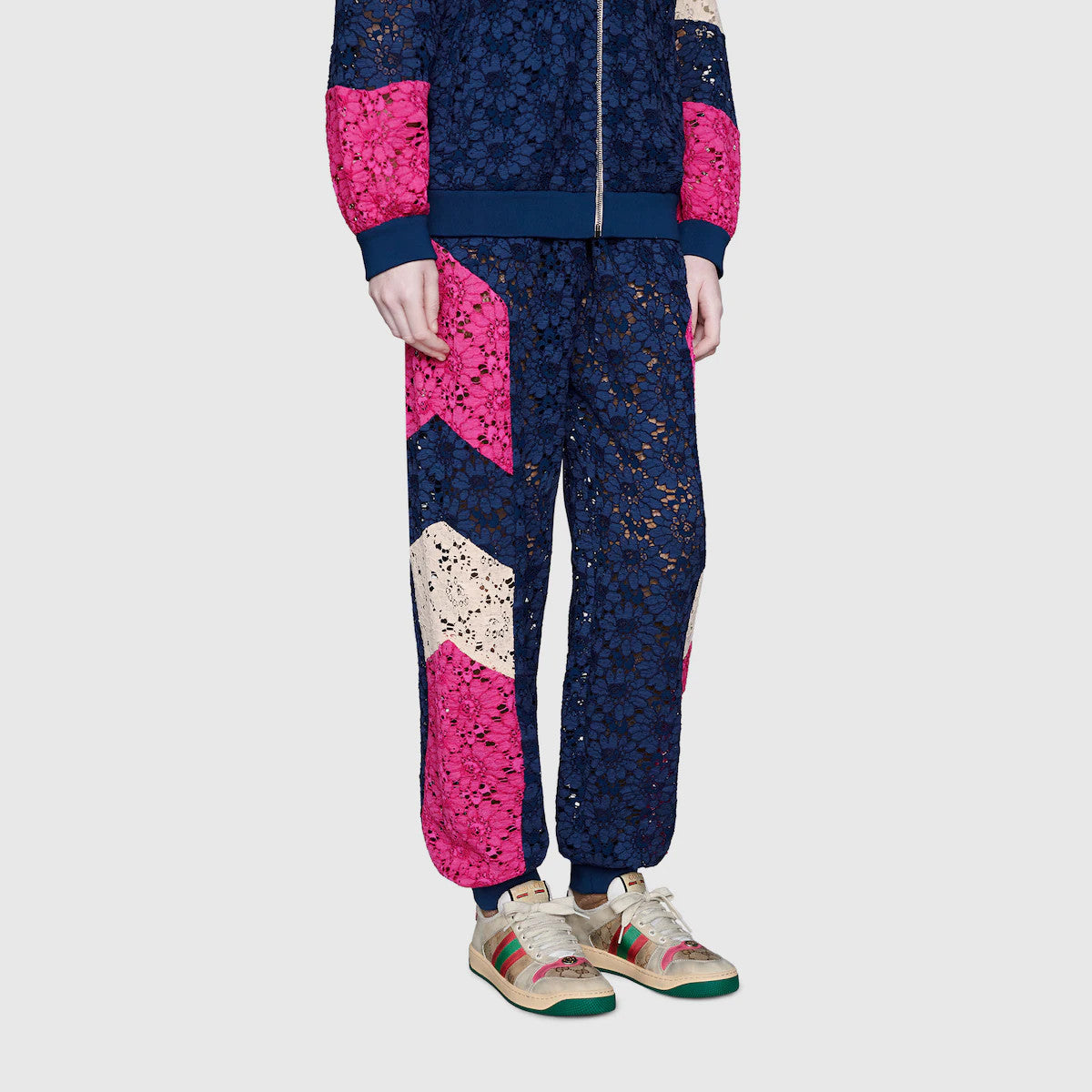 Influenciadas por las zapatillas clásicas de los años 70, las zapatillas Screener, que se llaman por el movimiento deportivo defensivo, cuentan con la franja web en el lateral y el logotipo vintage de Gucci, tratado con un efecto angustiado por todas partes. Un pastiche de diferentes influencias que se extienden a lo largo de décadas, la colección Pre-Fall 2019 continúa haciendo referencia a formas y materiales de la vieja escuela inspirados en la ropa deportiva vintage.